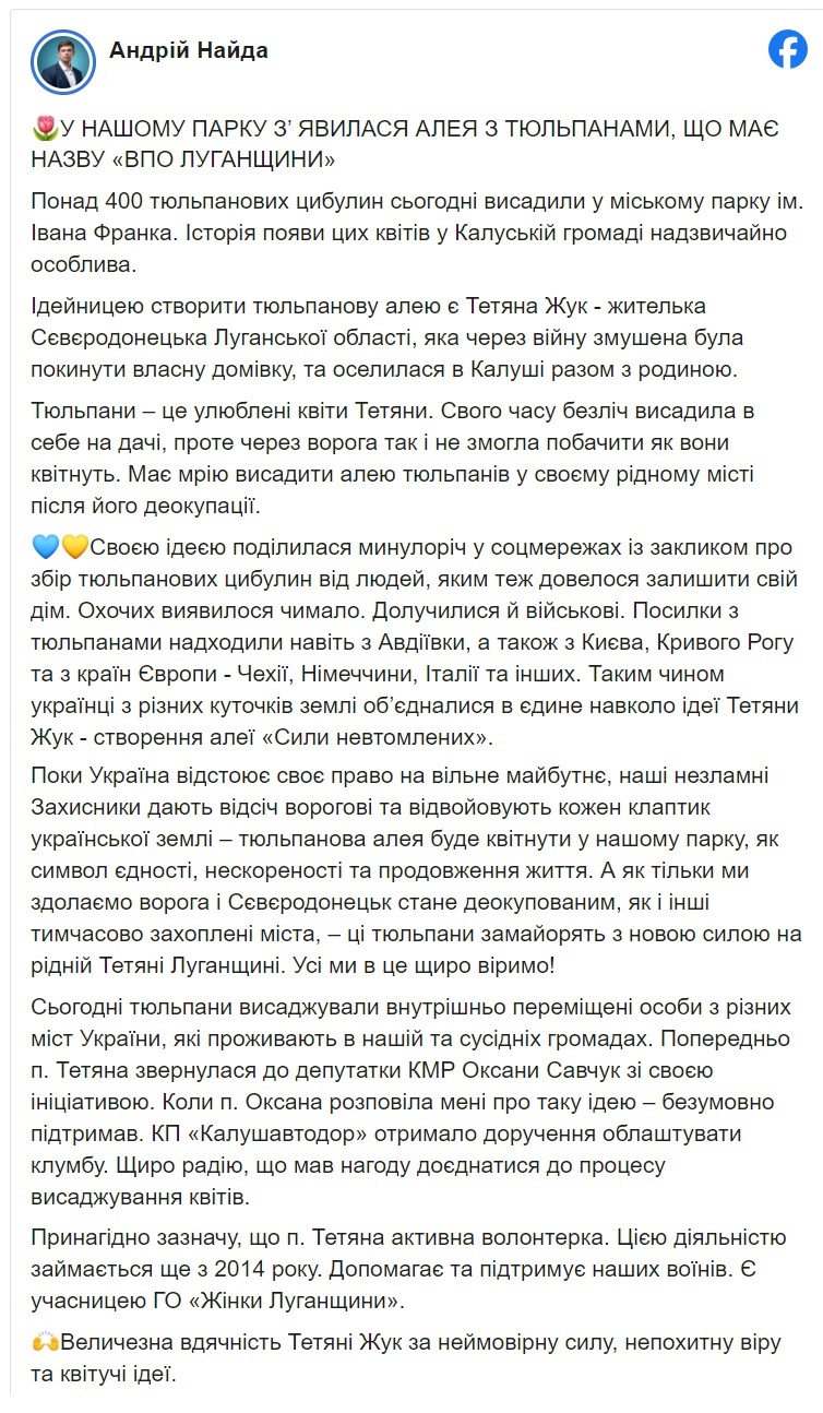 "Долучилися й військові. Посилки з тюльпанами надходили навіть з Авдіївки, а також з Києва, Кривого Рогу та з країн Європи: Чехії, Німеччини, Італії. Українці з різних куточків землі об’єдналися навколо ідеї Тетяни Жук — створення алеї "Сили невтомлених". Тільки Сєвєродонецьк стане деокупованим — ці тюльпани замайорять з новою силою на рідній Тетяні Луганщині. Усі ми в це щиро віримо!", — написав Андрій Найда.