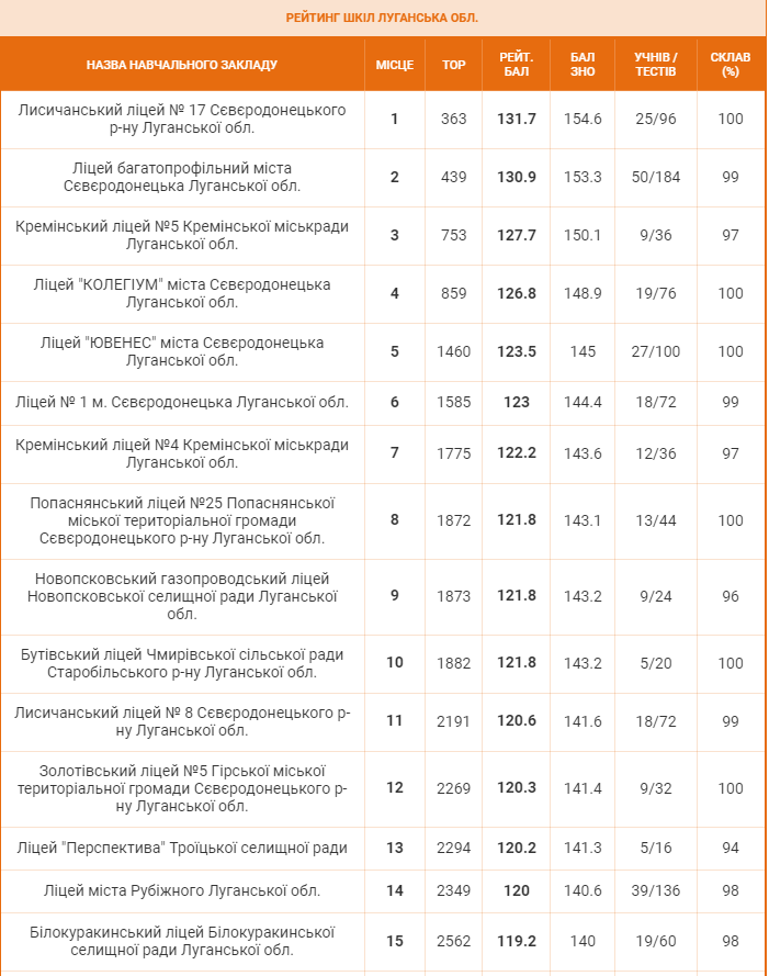 Інформаційним освітнім ресурсом «Освіта.ua» складений рейтинг загальноосвітніх шкіл Луганської області, що посіли найвищі місця у рейтингу шкіл України за підсумками НМТ 2024 року.