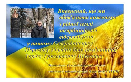 Впевнений, що ми обов'язково виженемо з рідної землі загарбників та відсвяткуємо у нашому Сєвєродонецьку Перемогу України біля пам'ятника Тарасу Григоровичу Шевченку.