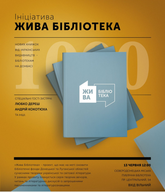 У першійзустрічі в рамках проекту “Жива бібліотека” 13 червня візьмуть участь відомі українські письменники Андрій Кокотюха, Сергій Жадан та Любко Дереш, видавець Олександр Красовицький, радник Міністра інфраструктури Юрій Гусєв, соціальний психолог Тамара Сухенко, журналіст Матвій Нікітін.Серед книжок, якими поповняться бібліотечні фонди у Луганській і Донецькій областях, такі видання, як патріотична бібліотека видавництва “Фоліо”, військові щоденники, зокрема “Іловайськ” Є.Положія, “Історія з грифом “секретно” В.В’ятровича, книги В.Шкляра “Залишенець. Чорний ворон”, С.Алексієвич «У війни не жіноче обличчя», Сергій Жадана "Ворошиловград", Андрія Кокотюхи "Червоний", Любка Дереша "Голова Якова".