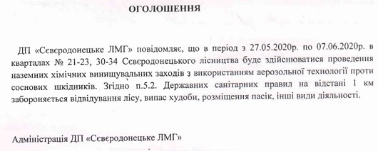 ДП "Сєвєродонецьке ЛМГ" повідомляє щодо проведення наземних хімічних винищувальних заходів