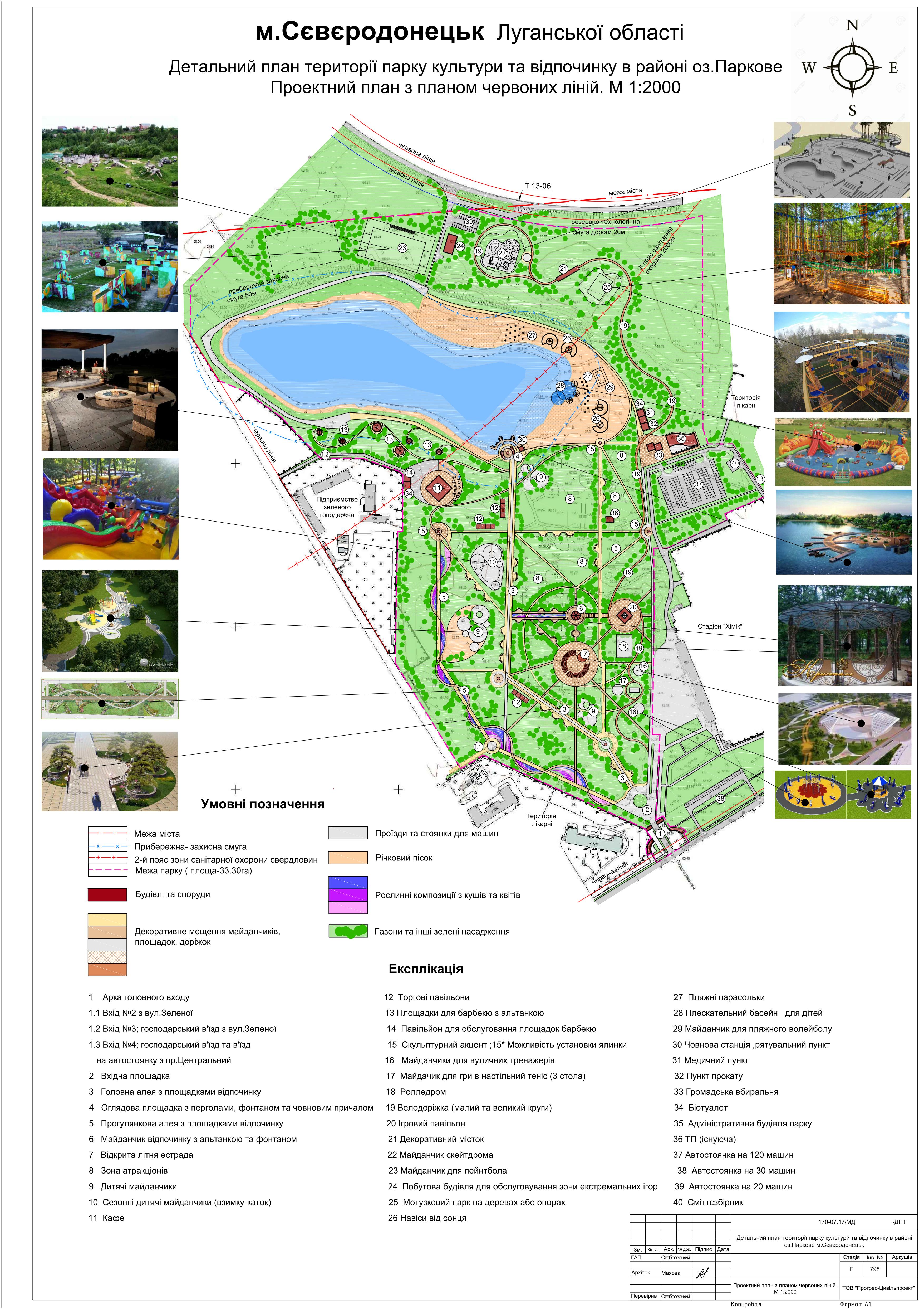 Проект «Детальний план території парку культури та відпочинку в районі оз. Паркове м. Сєвєродонецька» розроблений з метою уточнення положень генерального плану, визначення планувальної структури і функціонального призначення території парку культури та відпочинку в районі оз. Паркове. Детальний план складається із пояснювальної записки та графічних матеріалів. У проекті дана оцінка існуючої ситуації та визначені: основні принципи планувально-просторової організації забудови, зони функціонального використання території, режим та параметри забудови, містобудівні умови та обмеження, розміщення зон відпочинку, культурно-побутової забудови, інженерне забезпечення, організація транспортного та пішохідного руху, а також комплексний благоустрій території та озеленення.