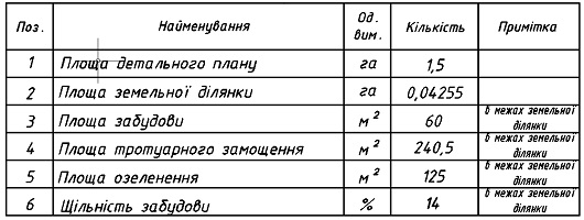 Основні техніко-економічні показники: Площа території на яку розроблений детальний план – 1,5 га. Детальний план розрахований орієнтовно на 7 років.