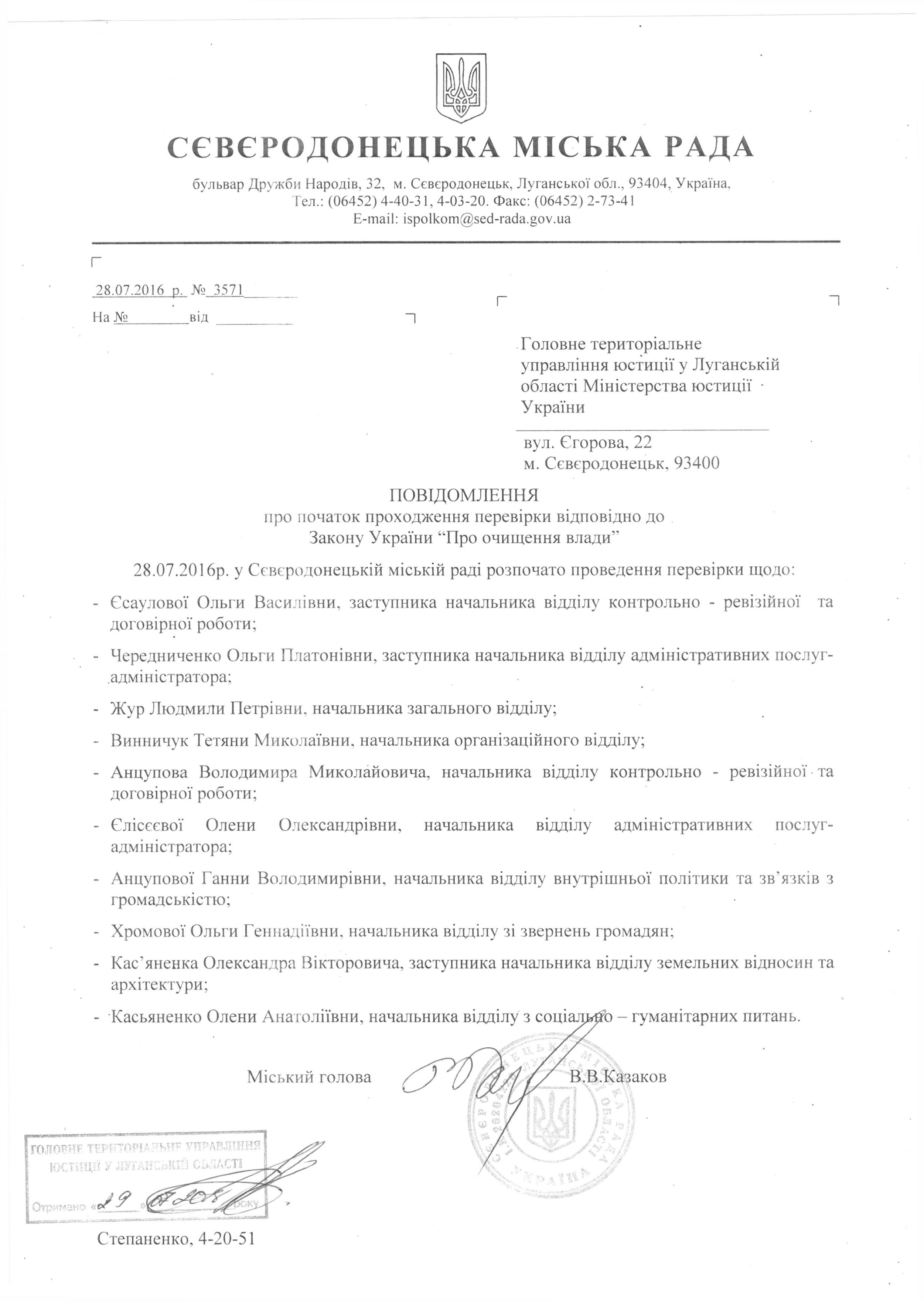 Повідомлення про початок перевірки працівників Сєвєродонецької міської ради