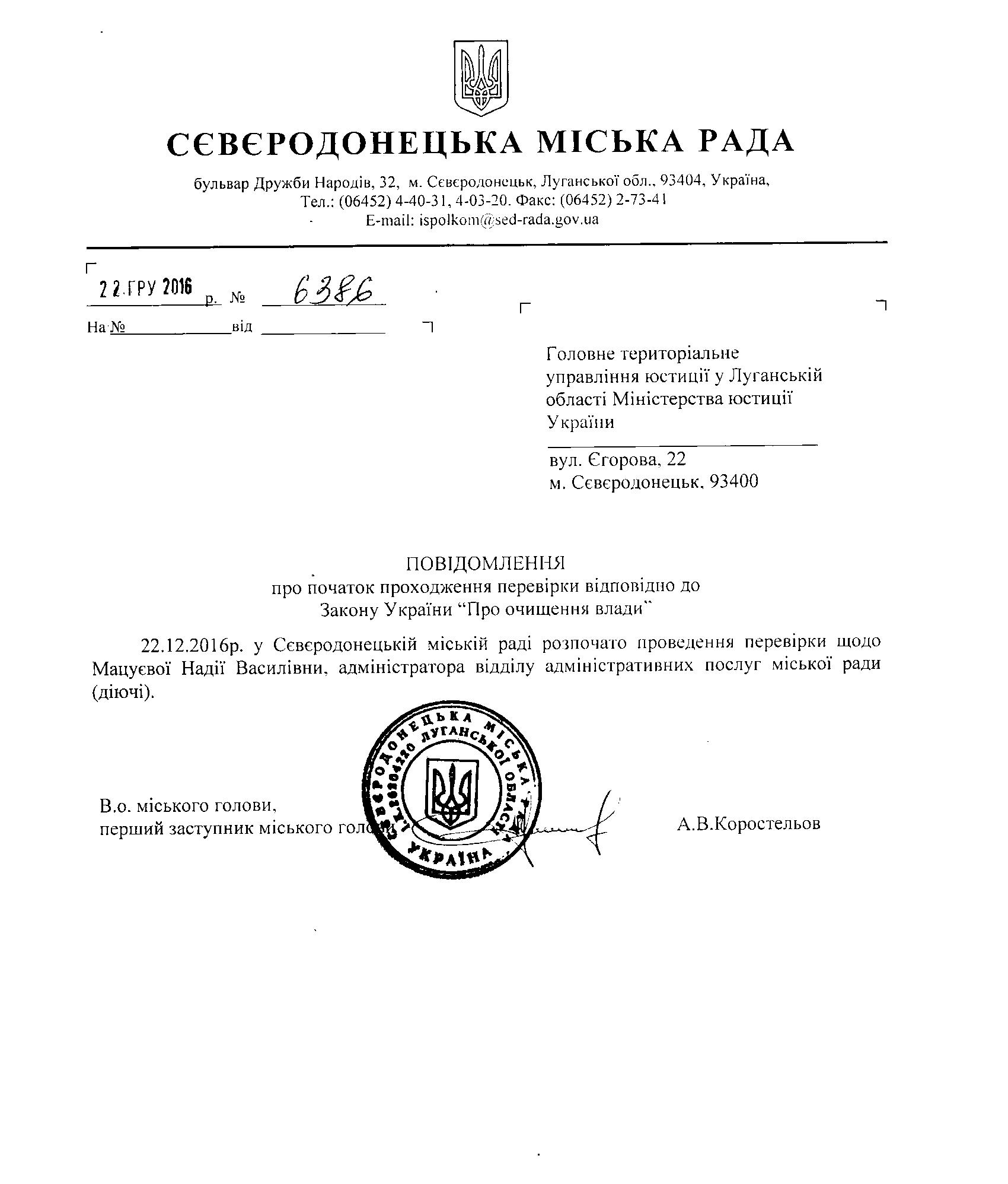Повідомлення про початок перевірки щодо адміністратора відділу адміністративних послуг Сєвєродонецької міської ради Мацуєвої Надії Василівни