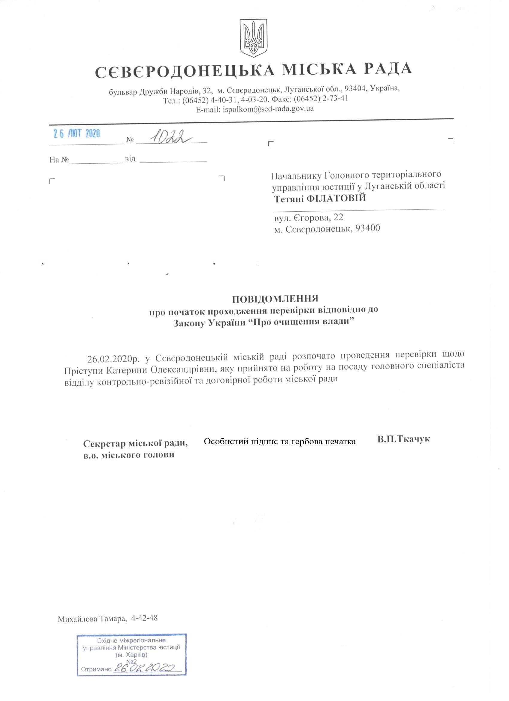 Повідомлення про початок перевірки щодо головного спеціаліста відділу контрольно-ревізійної та договірної роботи міської ради Пріступи Катерини Олександрівни