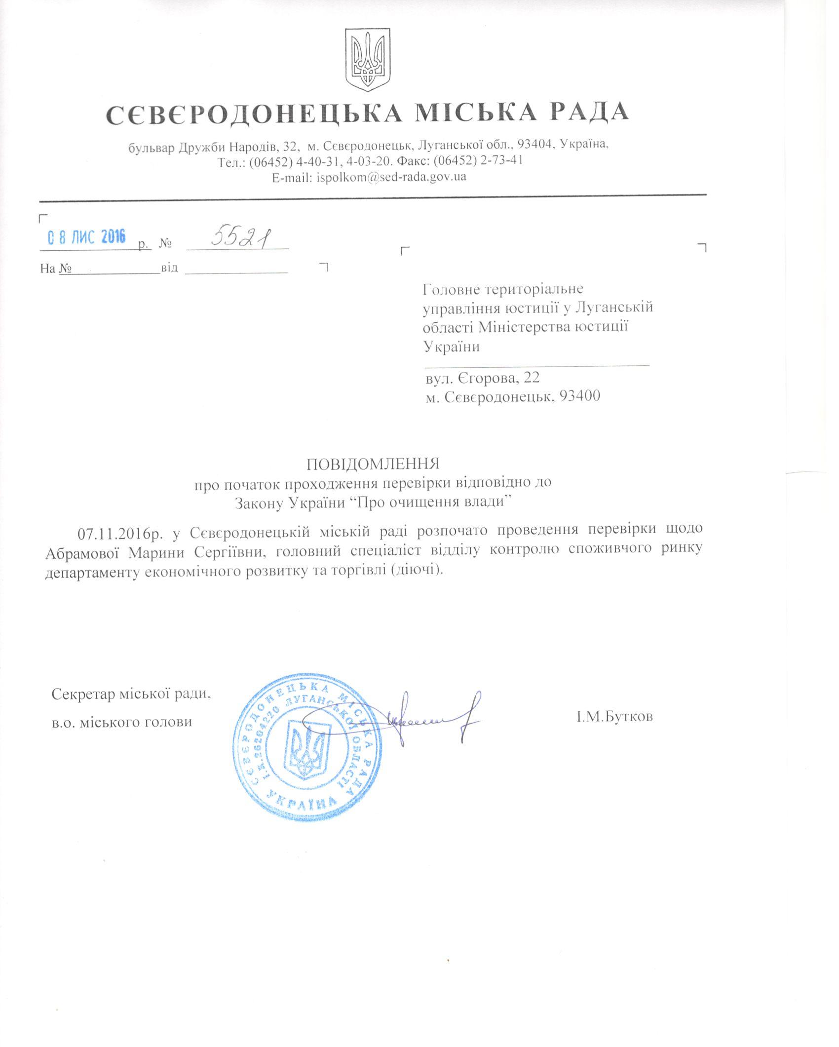 Повідомлення про початок перевірки щодо головного спеціаліста відділу контролю споживчого ринку департаменту економічного розвитку та торгівлі Сєвєродонецької міської ради Абрамової Марини Сергіївни