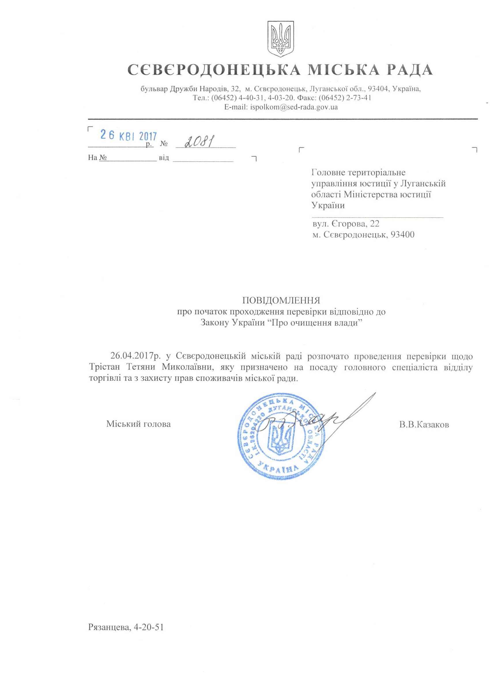 Повідомлення про початок перевірки щодо головного спеціаліста відділу торгівлі та з захисту прав споживачів міської ради Трістан Тетяни Миколаївни