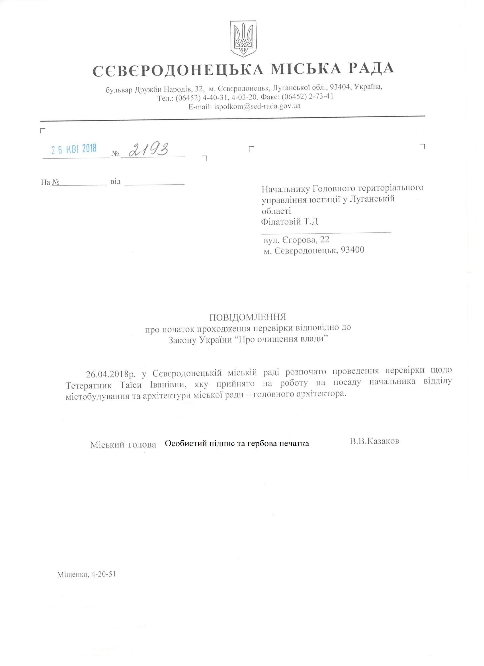 Повідомлення про початок перевірки щодо начальника відділу містобудування та архітектури міської ради - головного архітектора Тетерятник Таїси Іванівни