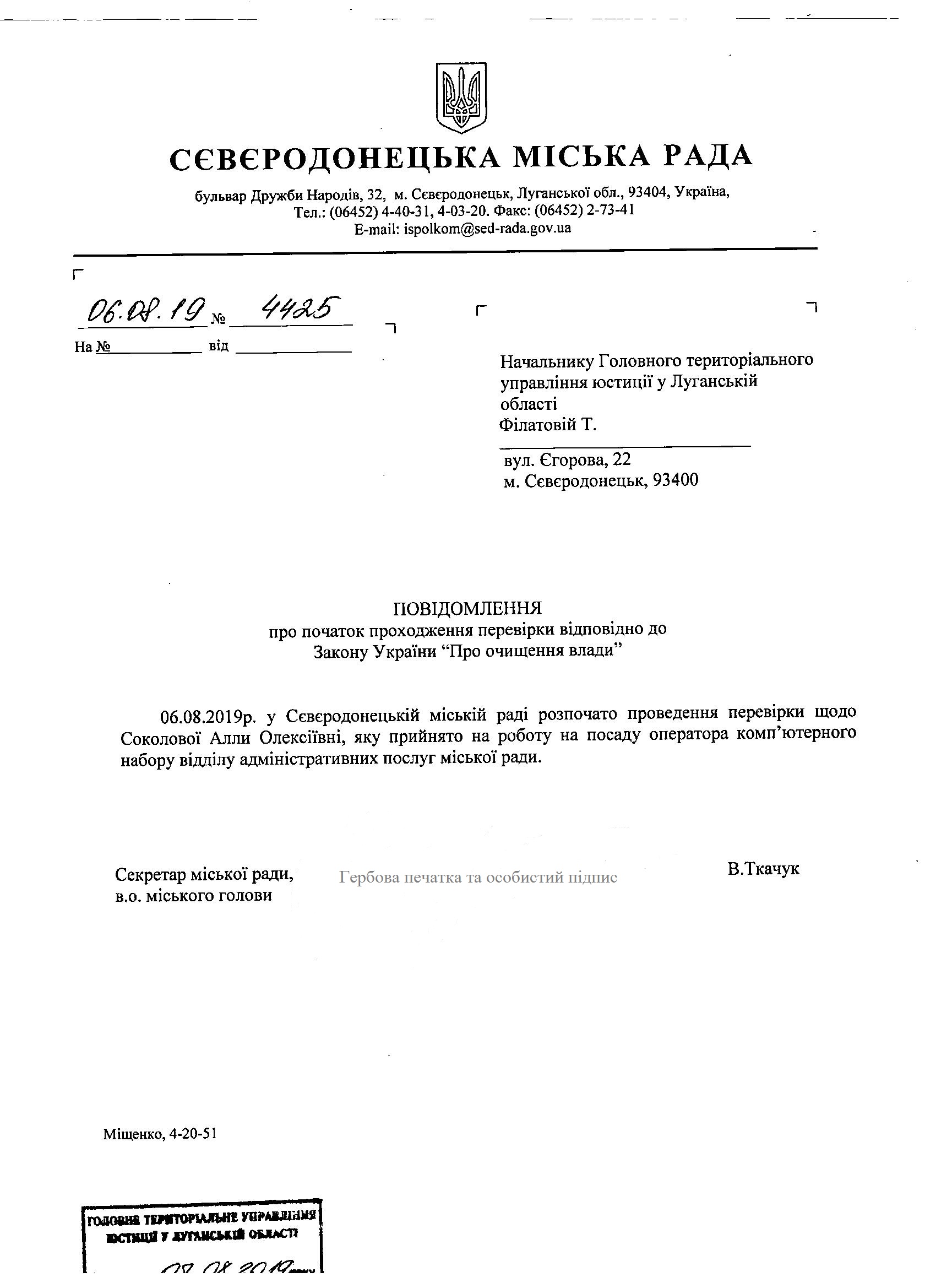 Повідомлення про початок перевірки щодо оператора комп’ютерного набору відділу адміністративних послуг міської ради Соколової Алли Олексіївни