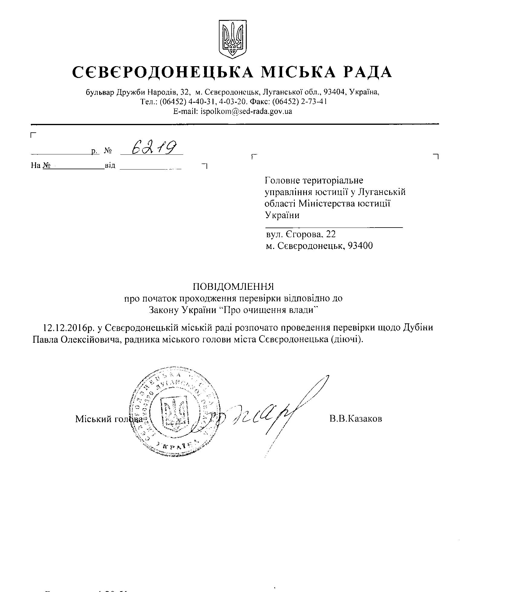 Повідомлення про початок перевірки щодо радника міського голови міста Сєвєродонецька Дубіни Павла Олексійовича