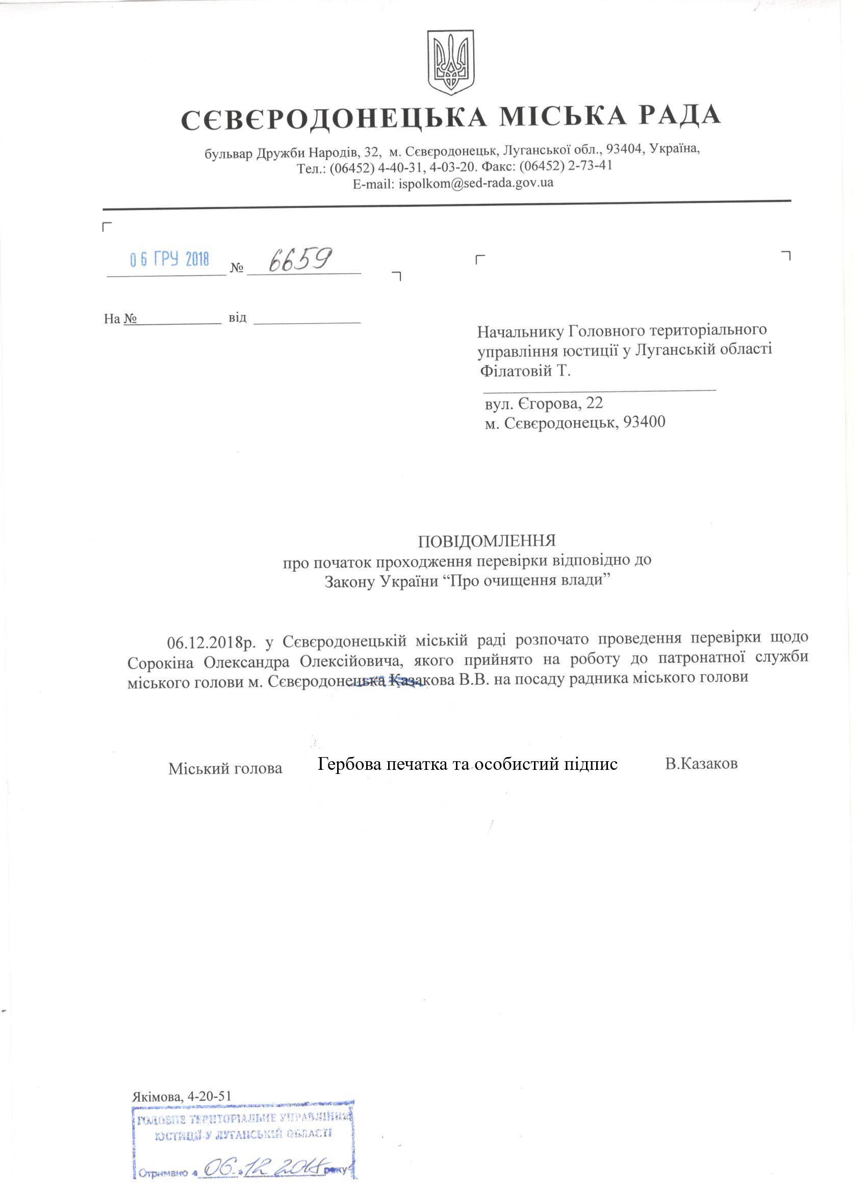Повідомлення про початок перевірки щодо радника міського голови м.Сєвєродонецька Сорокіна Олександра Олексійовича