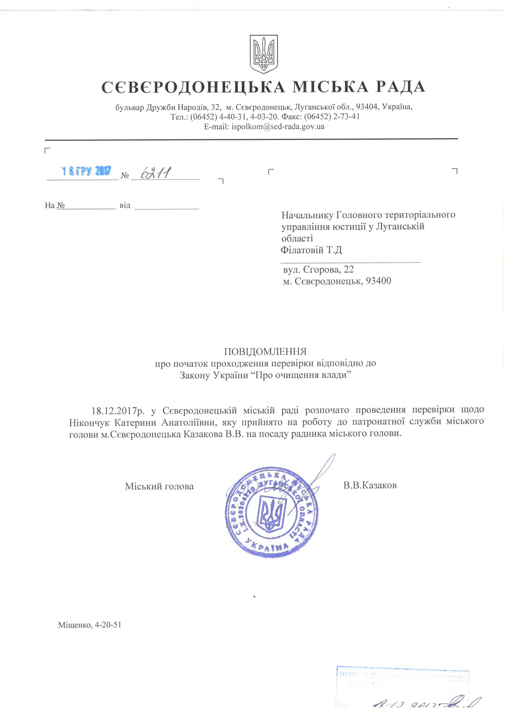 Повідомлення про початок перевірки щодо радника міського голови Нікончук Катерини Анатоліївни