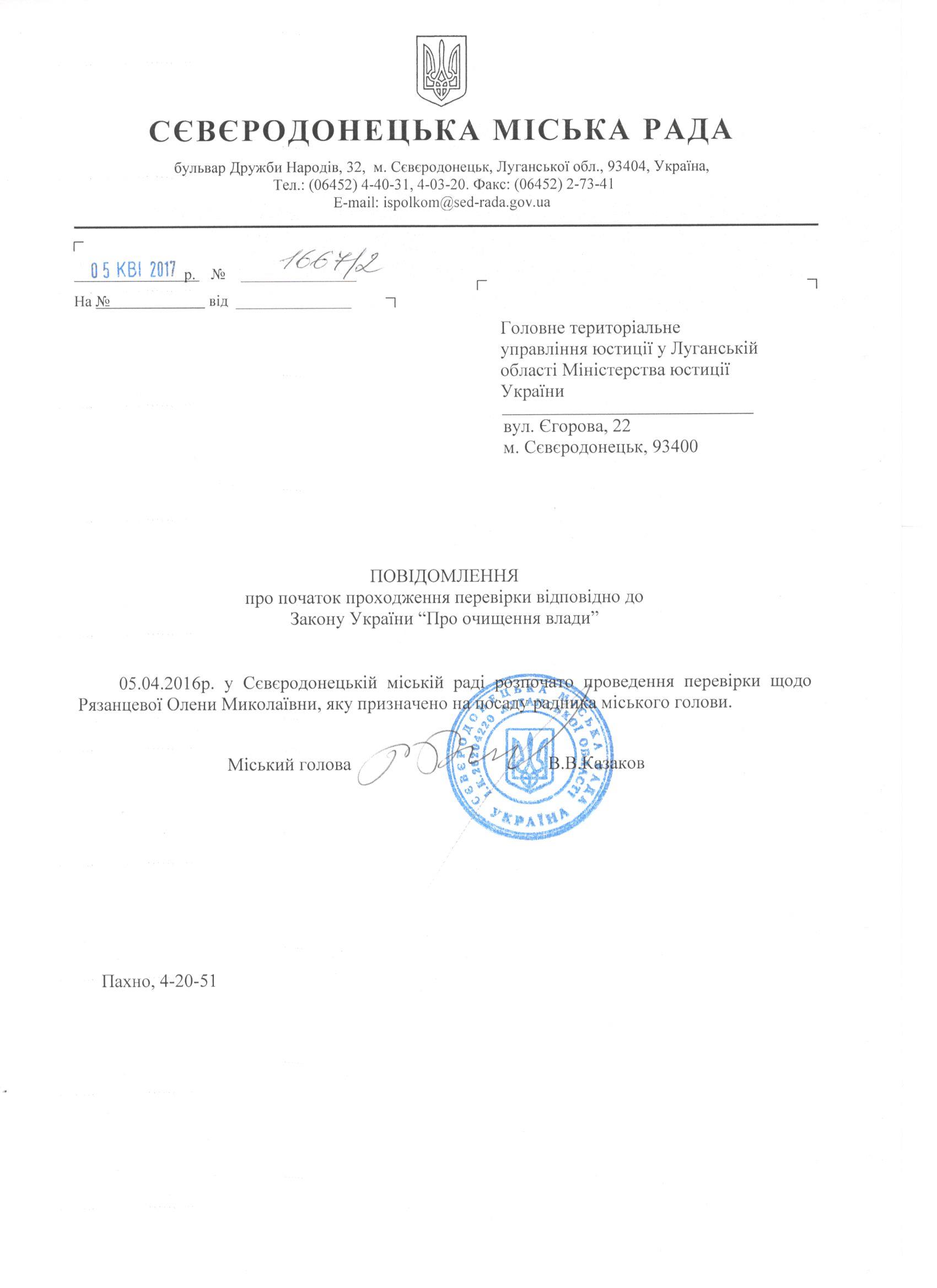 Повідомлення про початок перевірки щодо радника міського голови Рязанцевої Олени Миколаївни