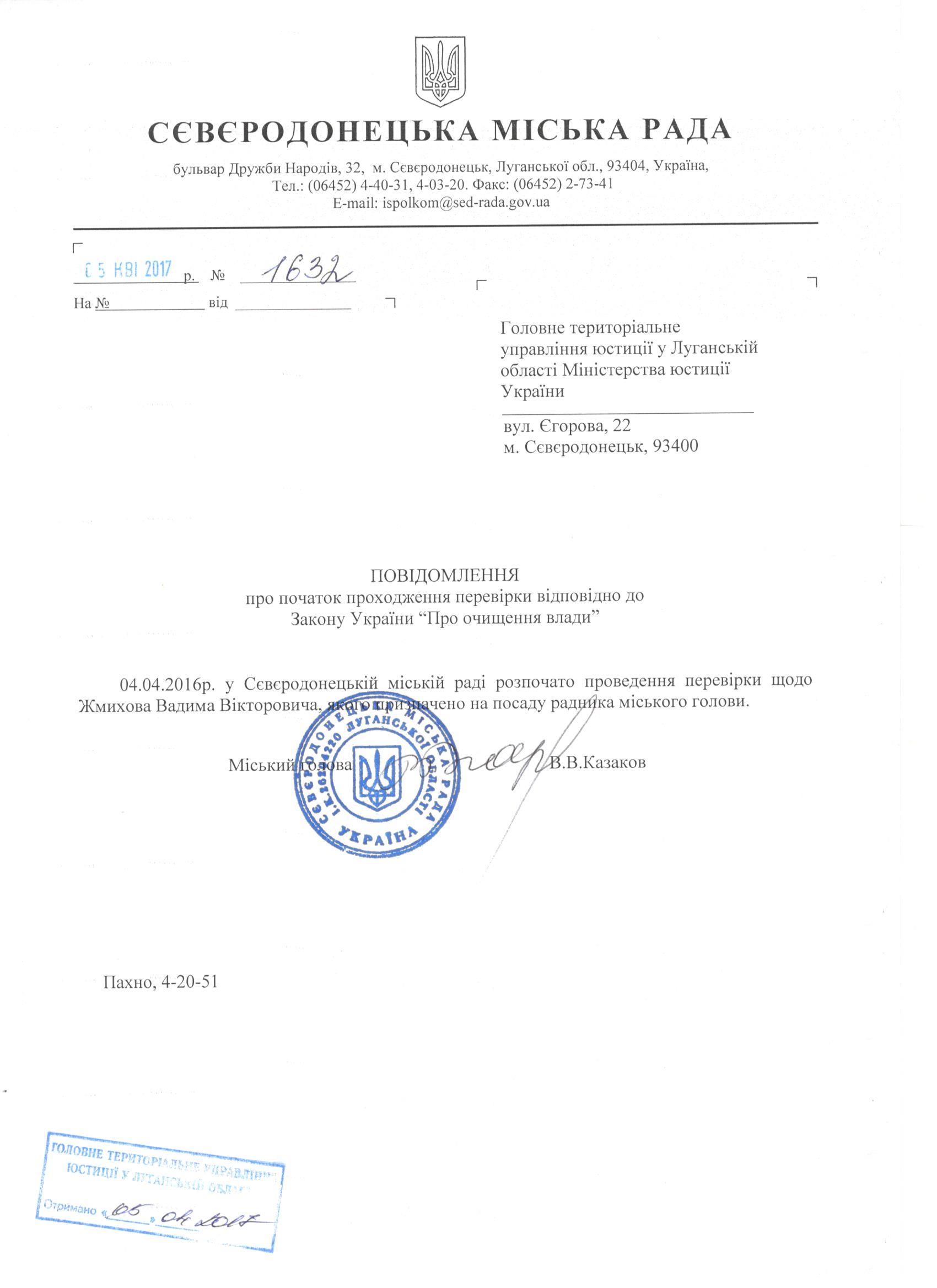 Повідомлення про початок перевірки щодо радника міського голови Жмихова Вадима Вікторовича