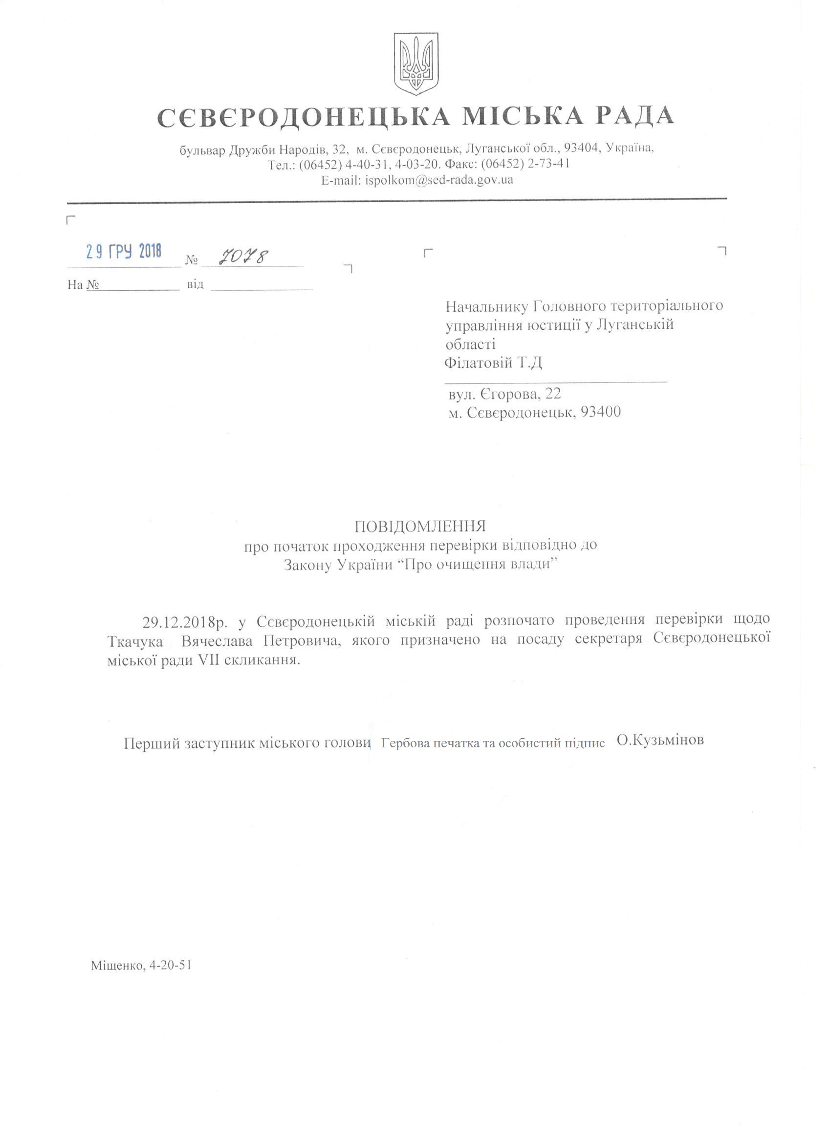 Повідомлення про початок перевірки щодо секретаря міської ради Ткачука Вячеслава Петровича