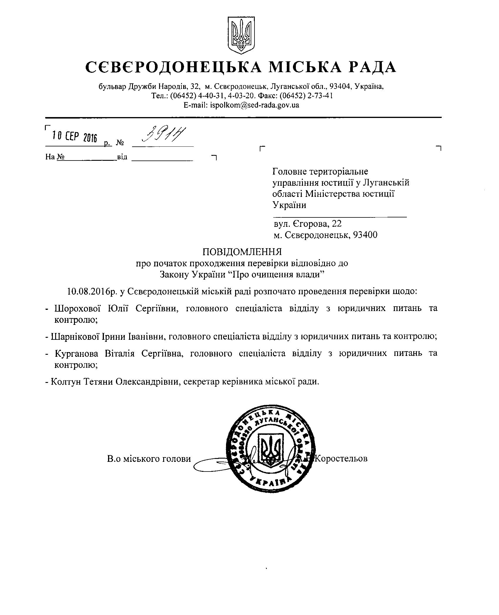 Повідомлення про початок перевірки щодо Шорохової Юлії Сергіївни, Шарнікової Ірини Іванівни, Курганова Віталія Сергійовича, Колтун Тетяни Олександрівни