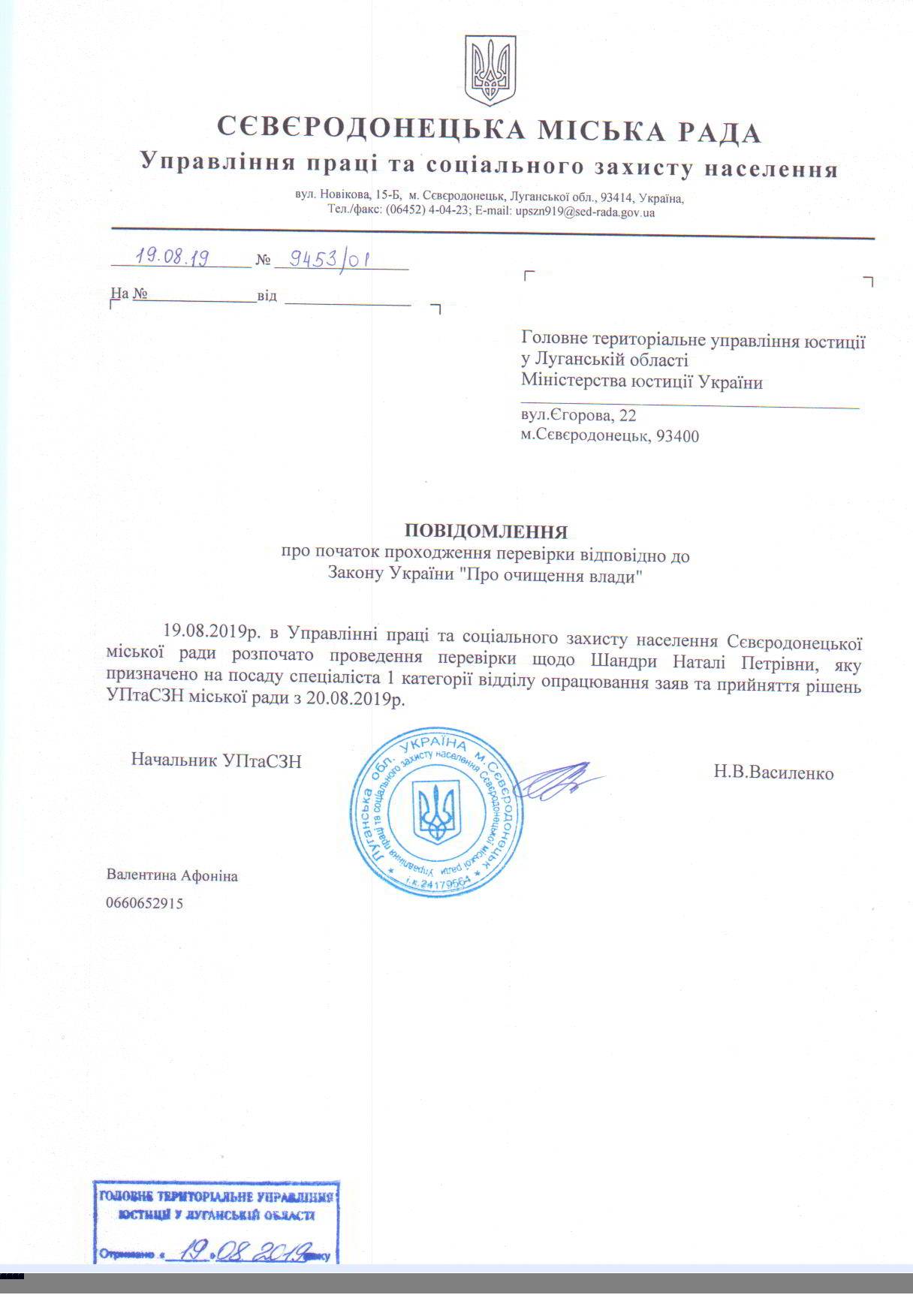 Повідомлення про початок перевірки щодо спеціаліста 1 категорії відділу опрацювання заяв та прийняття рішень УПтаСЗН міської ради Шандри Наталі Петрівни