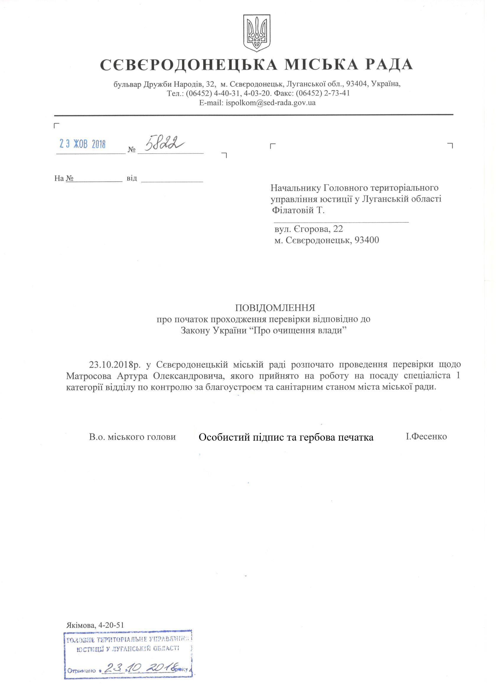 Повідомлення про початок перевірки щодо спеціаліста 1 категорії відділу по контролю за благоустроєм та санітарним станом міста міської ради Матросова Артура Олександровича
