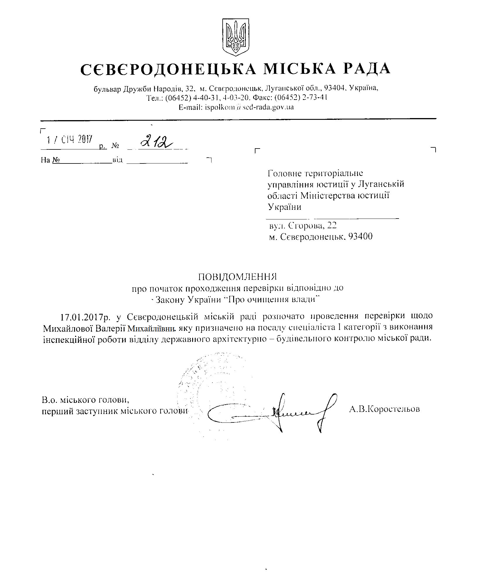 Повідомлення про початок перевірки щодо спеціаліста I категорії з виконання інспекційної роботи відділу державного архітектурно-будівельного контролю Сєвєродонецької міської ради Михайлової Валерії Михайлівни