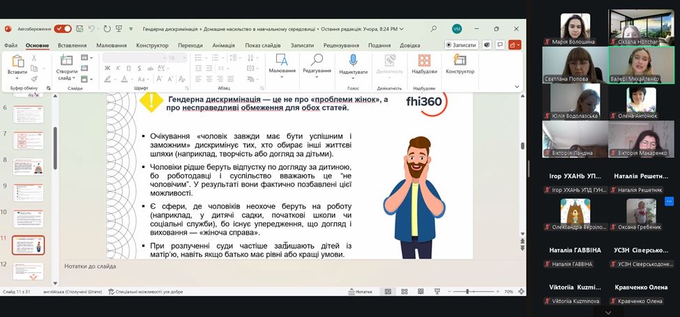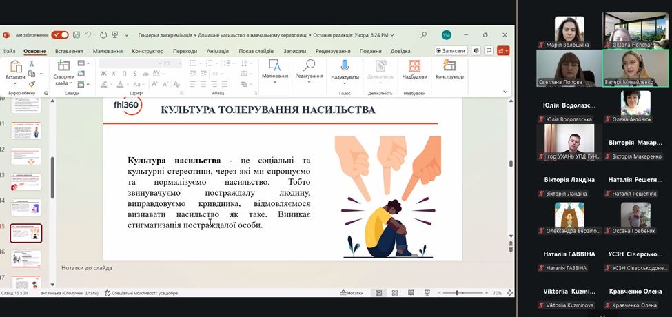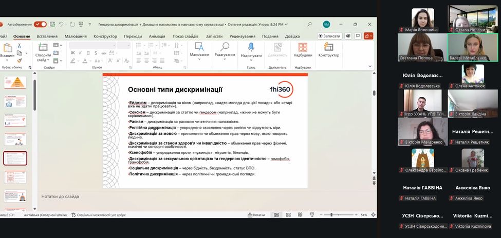 З ініціативою щодо співпраці до Сіверськодонецької міської ВА у сфері запобігання та протидії ґендерно зумовленому насильству звернулась Валерія Михайленко, фахівець програми захисту Family Health International in Ukraine (FHI 360). Саме вона висвітлила ґендерну дискримінацію як чинник появи насильства. Фахівець докладно довела до слухачів загальне визначення, види та форми дискримінації. Розглянули основні типи дискримінації: ейджизм, сексизм, расизм, релігійна дискримінація, дискримінація за мовою, дискримінація за станом здоров’я чи інвалідністю, ксенофобія, дискримінація за сексуальною орієнтацією та гендерною ідентичністю, соціальна дискримінація, політична дискримінація.
