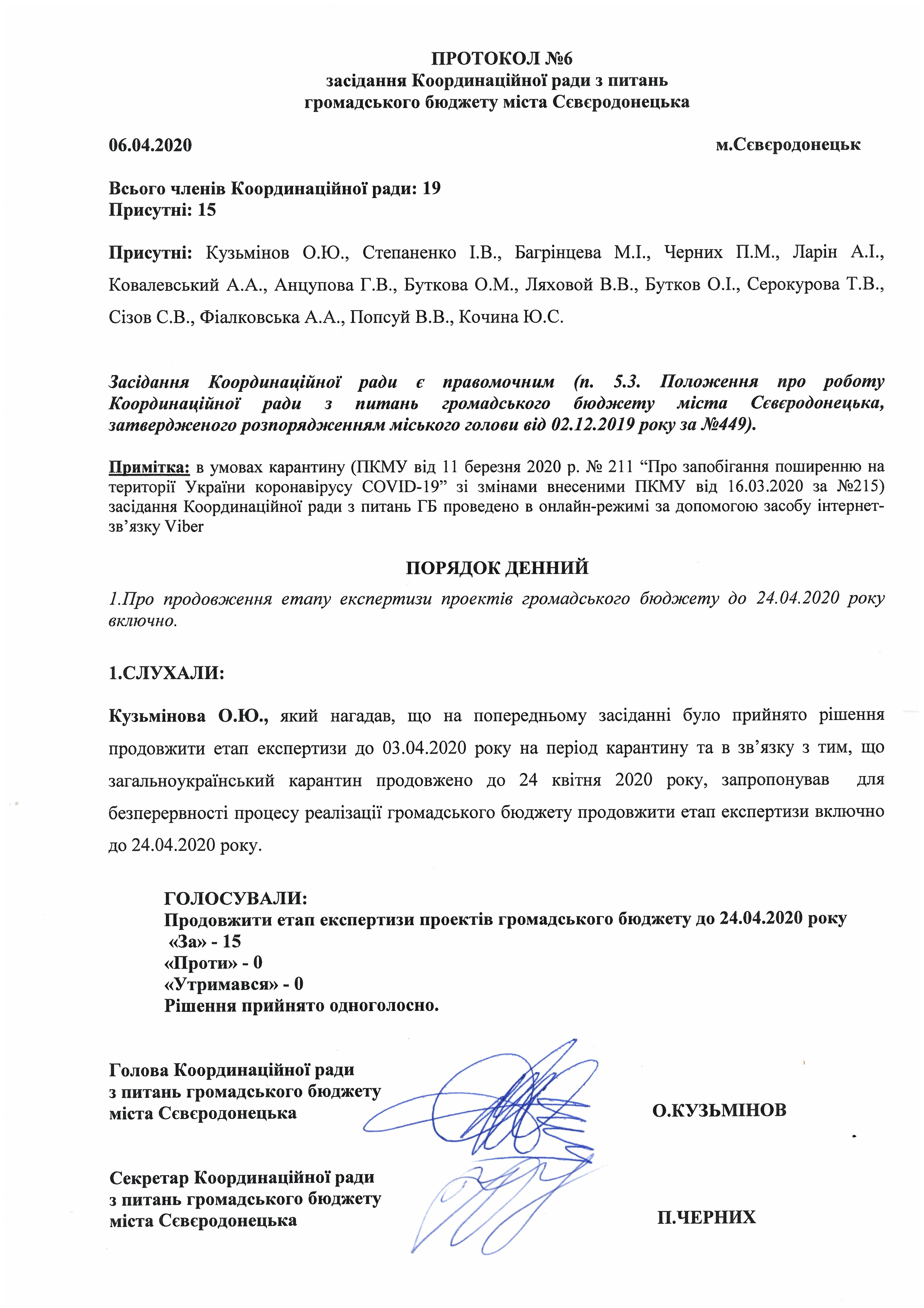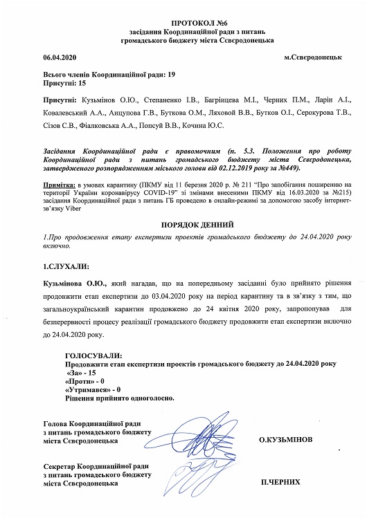 Протокол №6 засідання Координаційнлї ради з питань громадського бюджету міста Сєвєродонецька від 06.04.2020 року