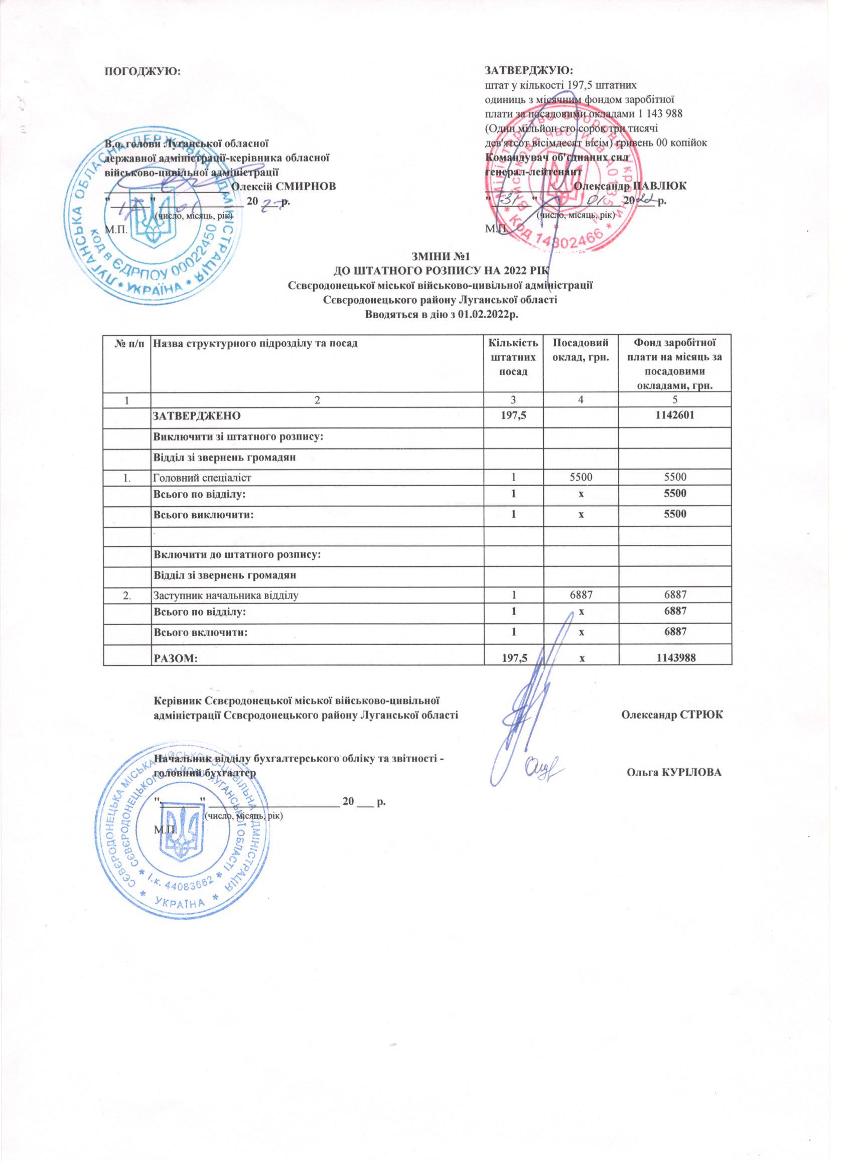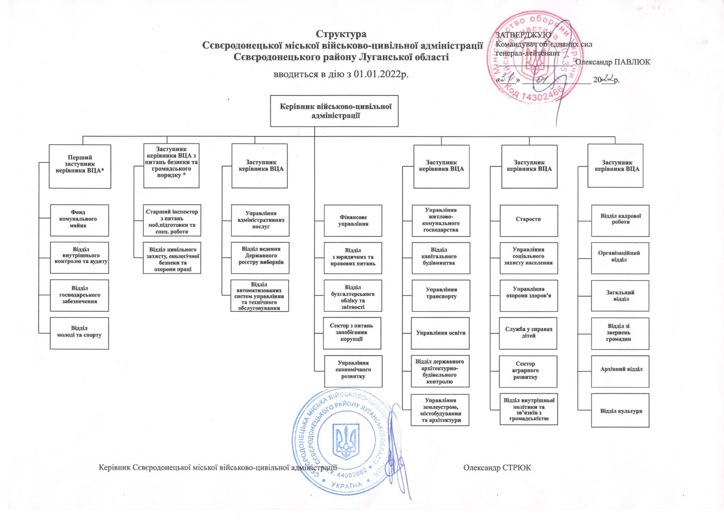 Про введення в дію структури та штатного розпису Сєвєродонецької міської військово-цивільної адміністрації Сєвєродонецького району Луганської області