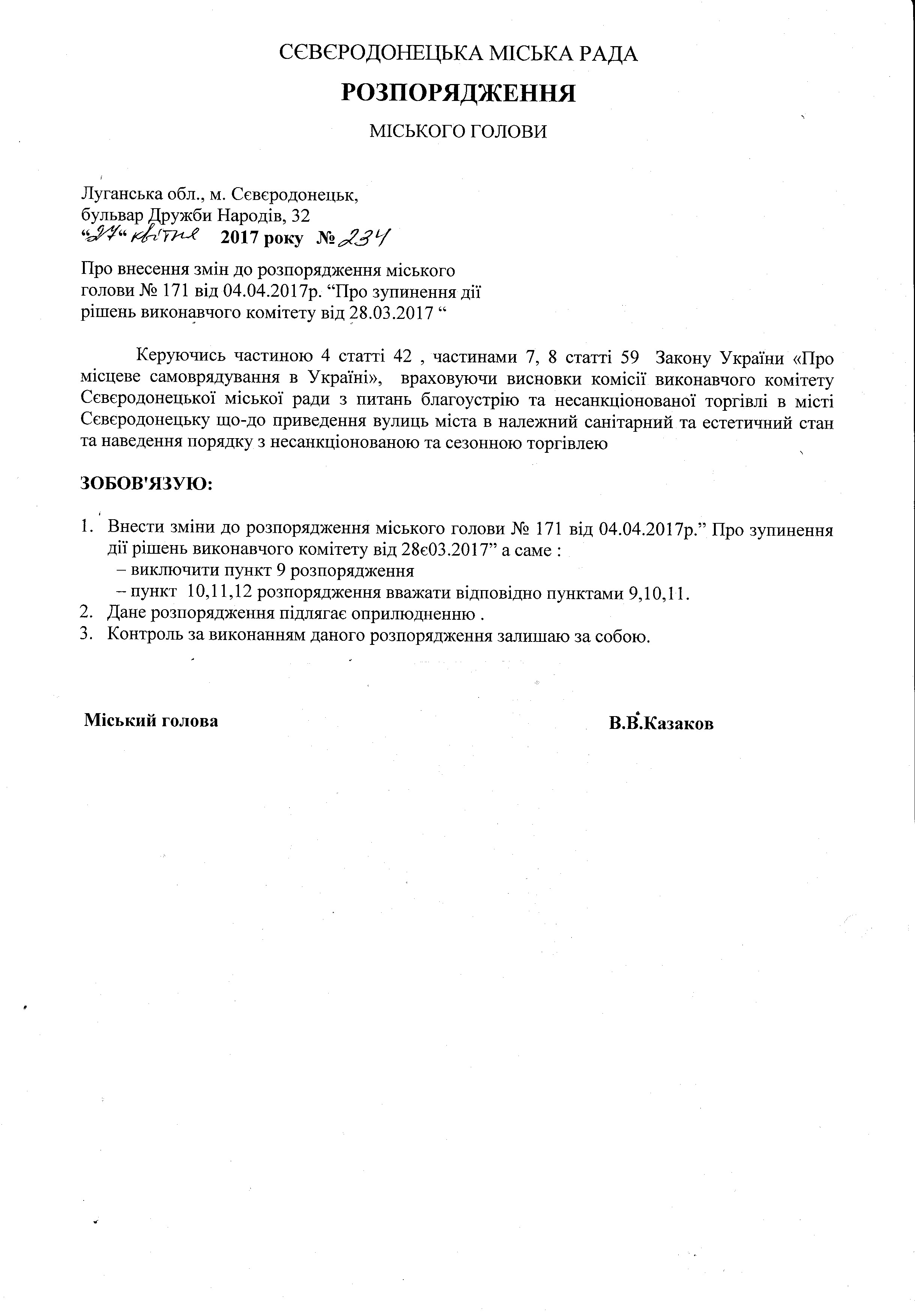 Про внесення змін до розпорядження міського голови № 171 від 04.04.2017р. “Про зупинення дії рішень виконавчого комітету від 28.03.2017 “