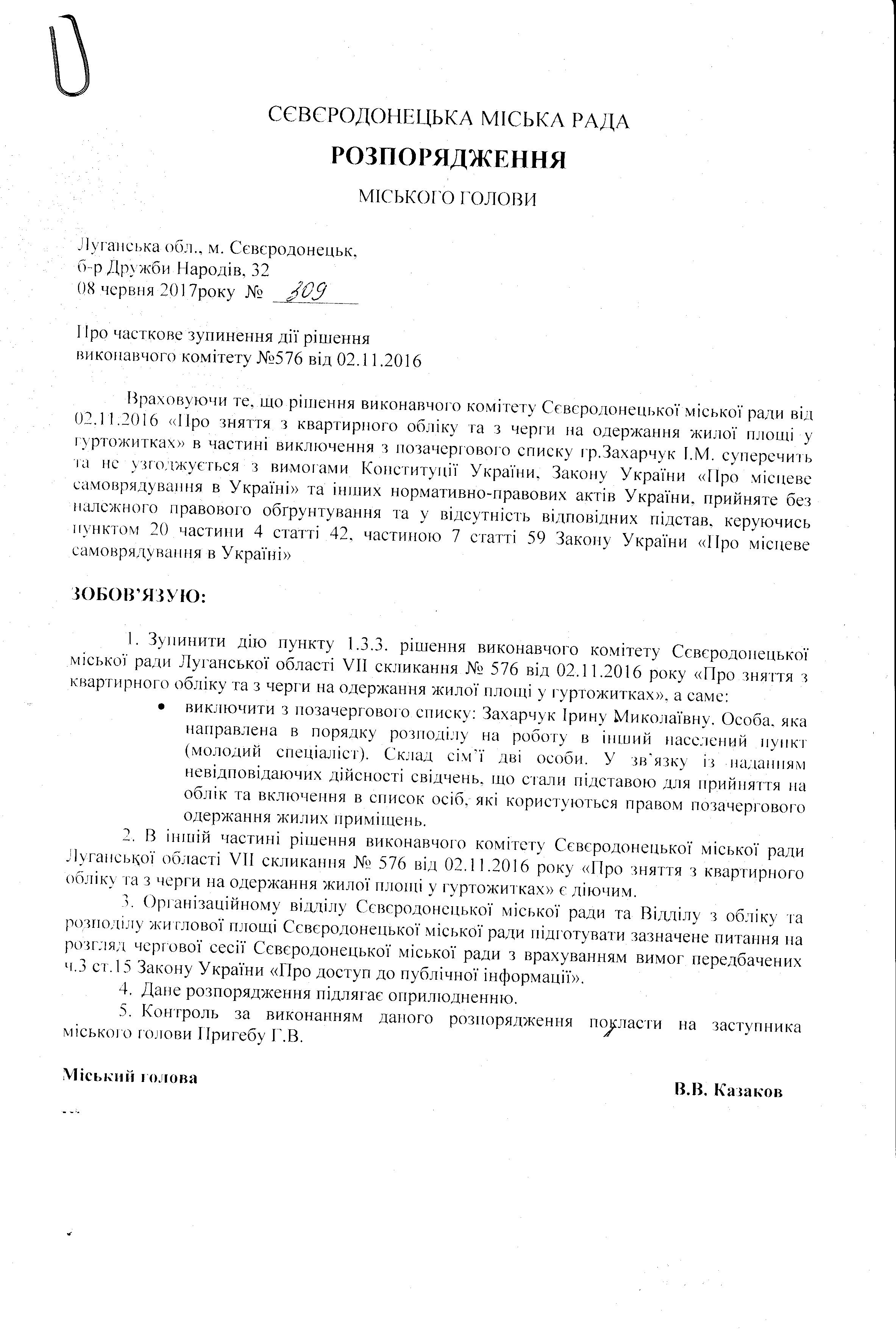 Розпорядження №309