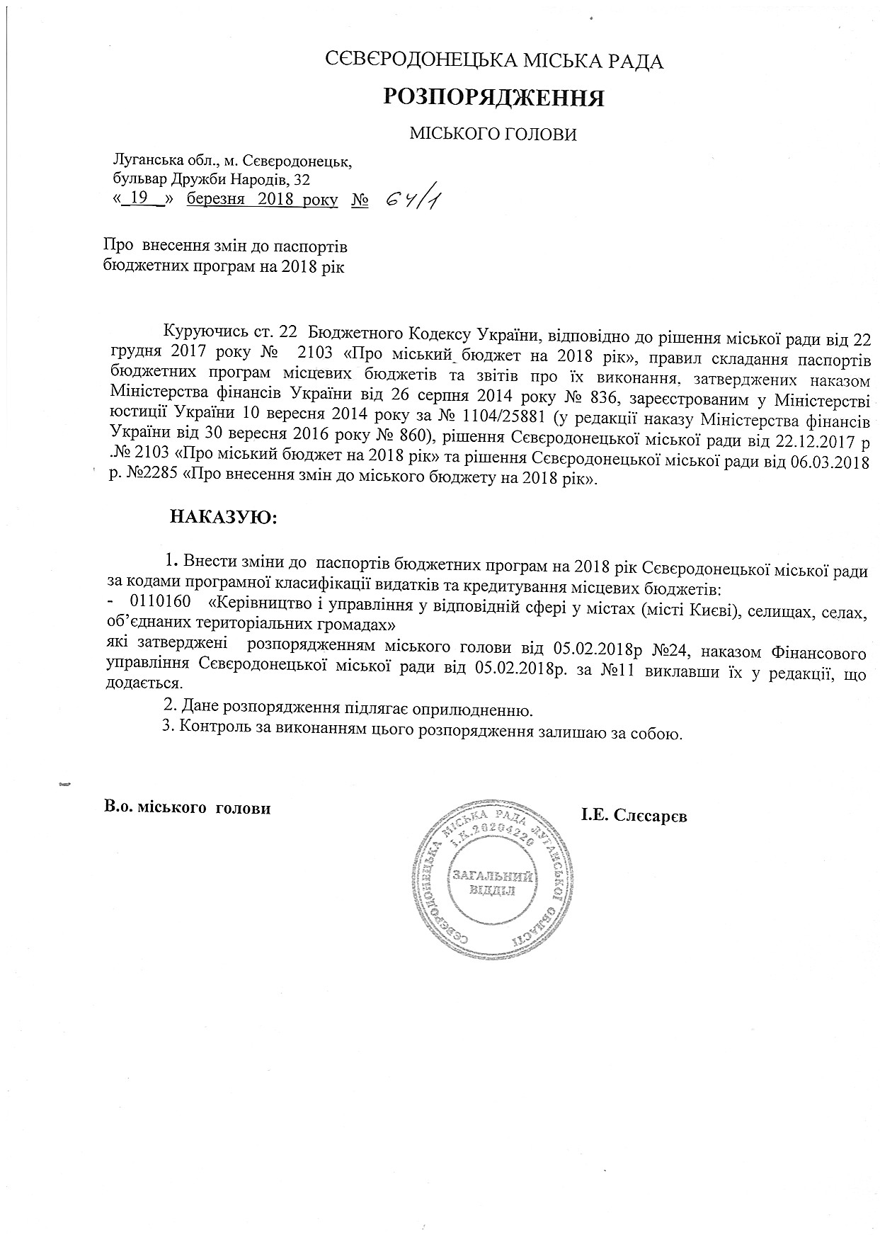 Розпорядження №64-1