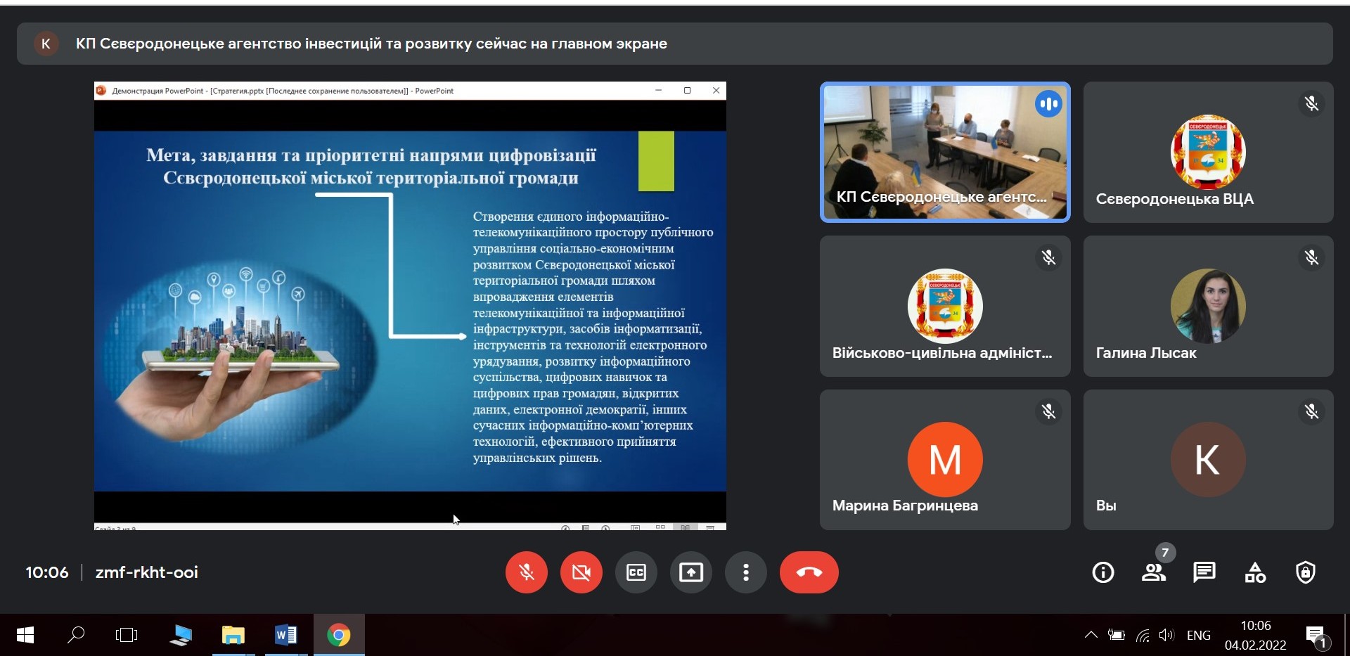 04 лютого 2022 рокувідбулось чергове засідання Робочої групи по розробці Стратегії цифрової трансформації Сєвєродонецької міської територіальної громади на 2022-2024 роки з метою обговорення напрацювань Робочої групи (робочих версій Стратегії та її окремих розділів).