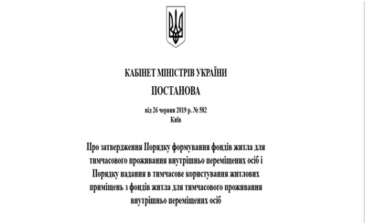 26 червня 2019 р. постановою Кабінету Міністрів України № 582 було затверджено «Порядок надання в тимчасове користування житлових приміщень з фондів житла для тимчасового проживання внутрішньо переміщених осіб» ( надалі – Порядок) ]]>https://zakon.rada.gov.ua/laws/show/582-2019-%D0%BF]]> , який визначає механізм надання в тимчасове користування житлових приміщень з фондів.