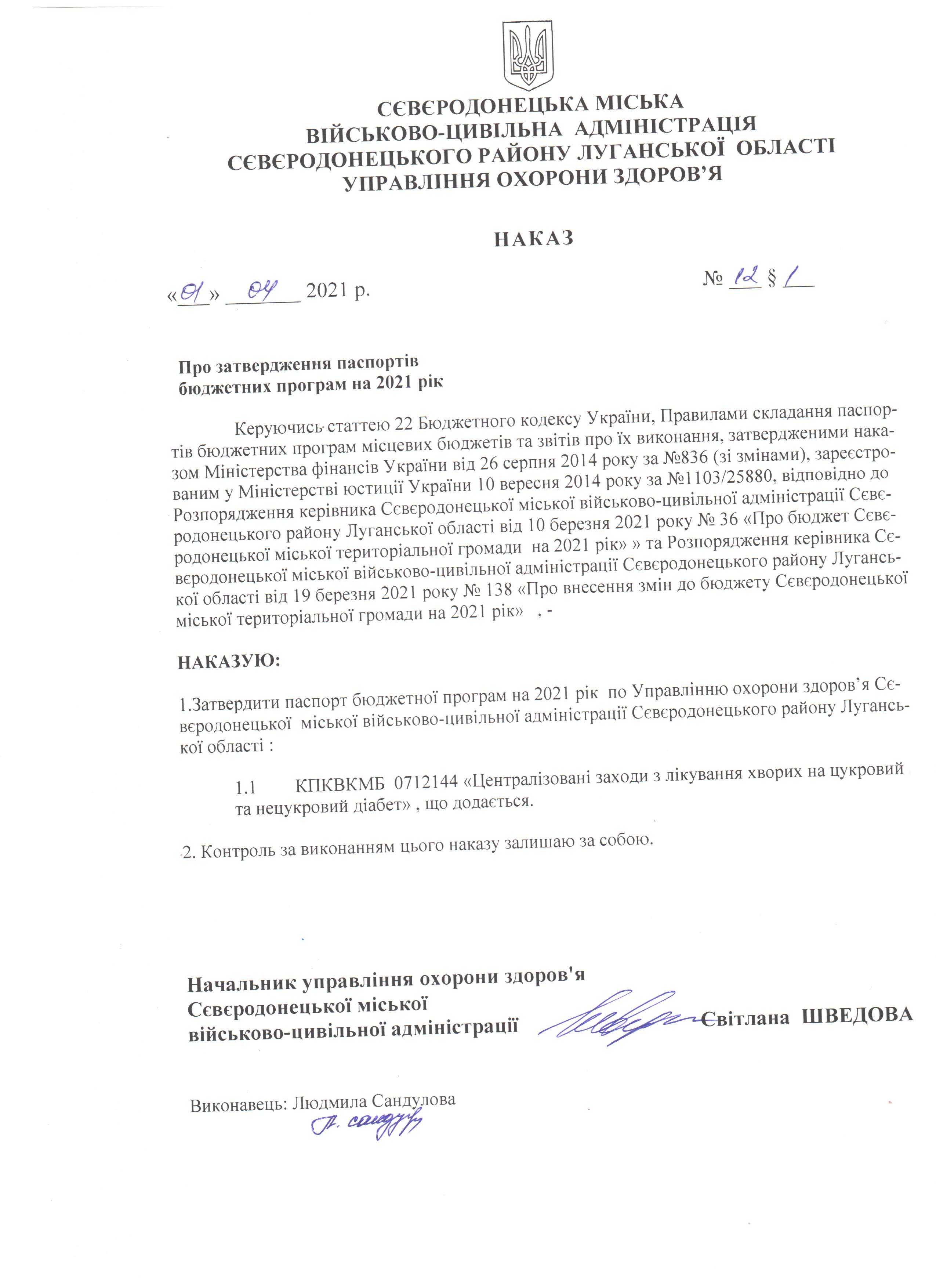 Наказ від 01.04.2021 року №12/1 та паспорт бюджетної програми