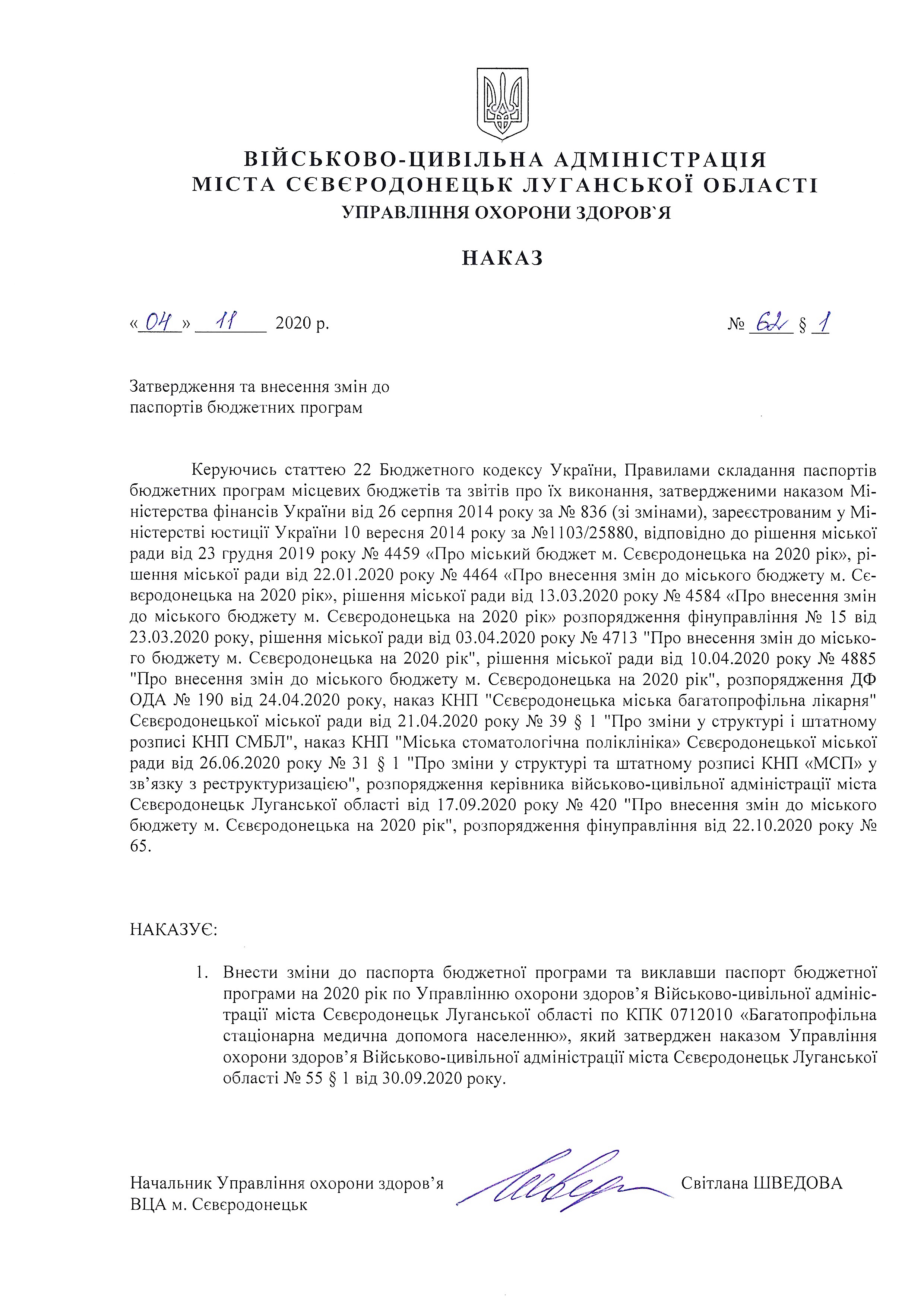 Наказ від 04.11.2020 року та паспорт бюджетної програми