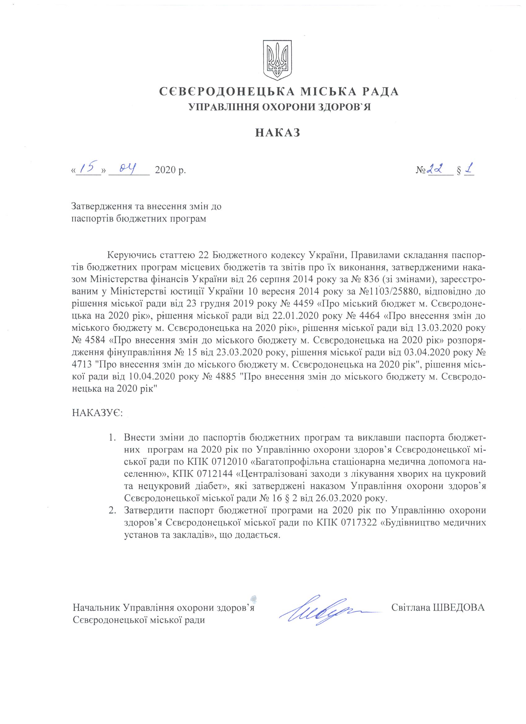 Наказ від 15.04.2020 №22 § 1 та паспорти бюджетних програм