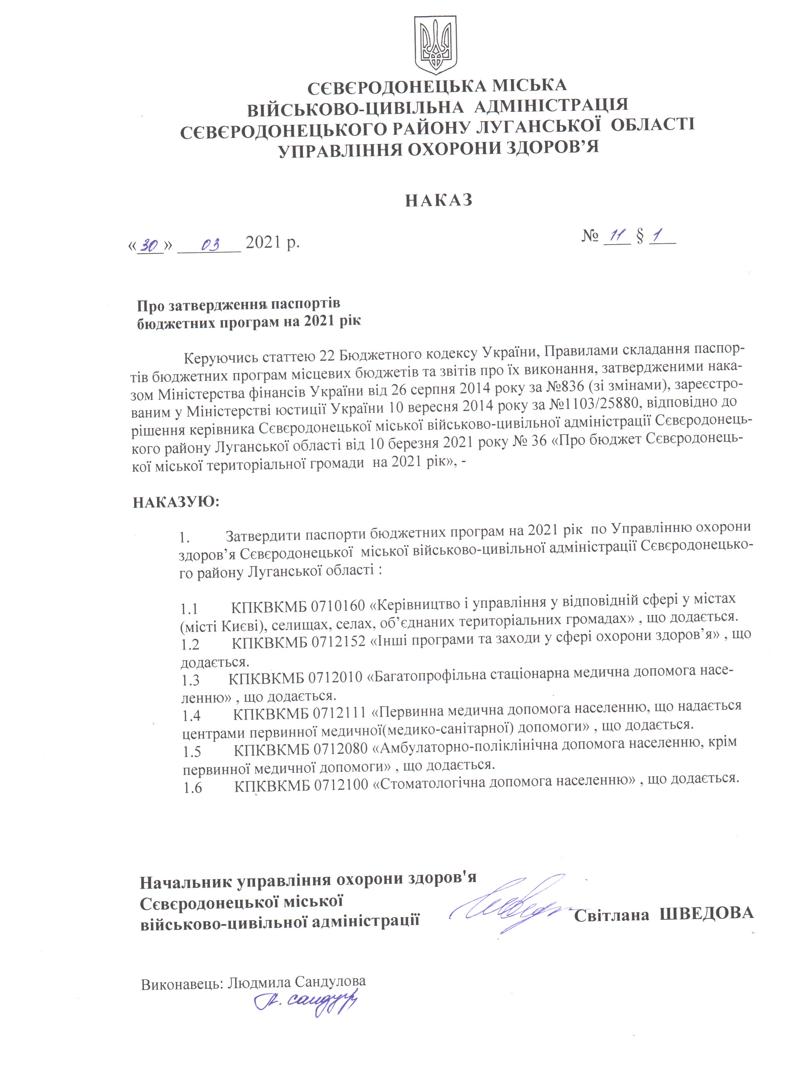 Наказ від 30.03.2021 року та паспорти бюджетних програм