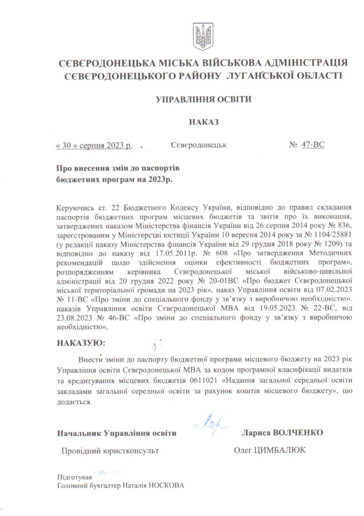 Наказ від 30.08.2023 року та паспорт бюджетної програми